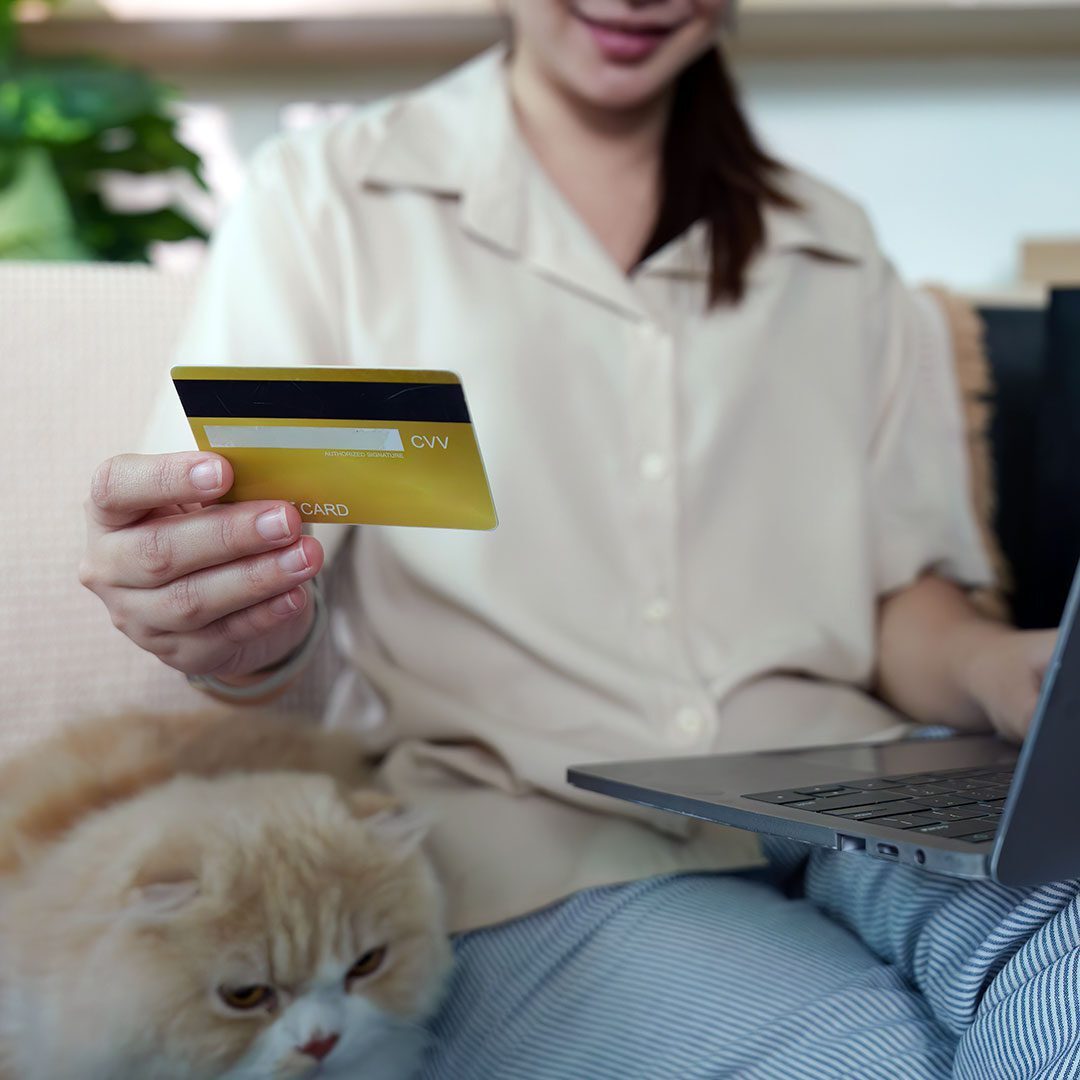woman holding up her credit card while typing in the number on her computer screen as her cat sits by her hip